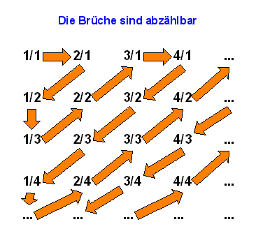 Man kann also alle Brüche in einer unendlich langen Liste aufführen und sie durchnummerieren: \begin{equation} \frac{1}{1}, \frac{2}{1}, \frac{1}{2}, \frac{1}{3}, \frac{2}{2}, \frac{3}{1}, \frac{4}{1}, \frac{3}{2}, \frac{2}{3}, \frac{1}{4} , ... \end{equation} (doppelte wie 1 und 2/2 etc. müsste man hier noch streichen). Die Menge der rationalen Zahlen ist also gleich mächtig wie die Menge der natürlichen Zahlen, obwohl die rationalen Zahlen dicht auf dem Zahlenstrahl liegen (d.h. in beliebig kleinen Intervallen auf dem Zahlenstrahl liegen immer unendlich viele rationale Zahlen).