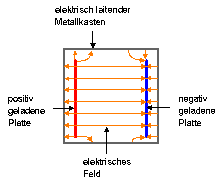 Im Kondensator wirken zwischen den geladenen Platten sowie zwischen Platten und Abschirmung elektrische Kräfte. Diese Kräfte addieren sich beim ruhenden oder gleichförmig bewegten Kondensator insgesamt zu Null, d.h. der Kondensator übt insgesamt auf sich selber keine Kraft aus, solange er nicht beschleunigt wird.